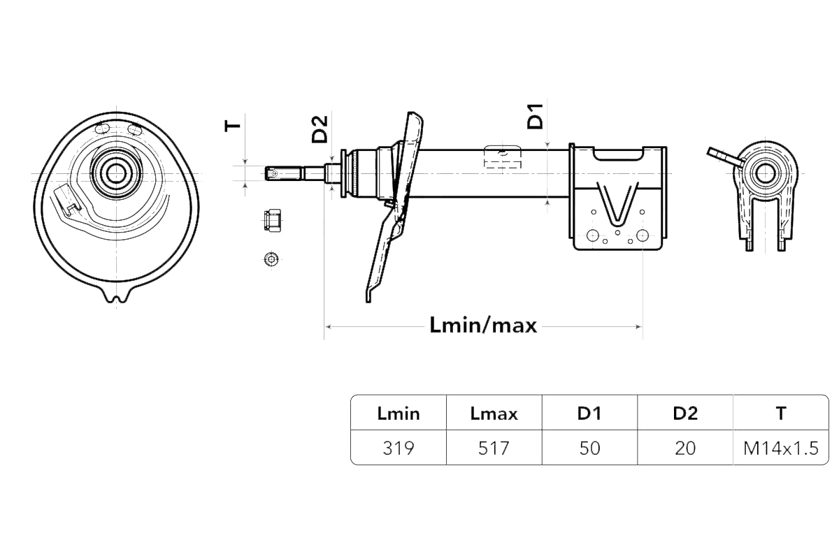 | القياسات: | القطر: 51 ملم الطول: 517 / 319 ملم قطر التجويف: 12 ملم البعد بين ثقوب التثبيت: 53 ملم البرغي: M14x1,5 قطر قضبان المكبس: 20 ملم طول قضبان المكبس: 59 ملم |