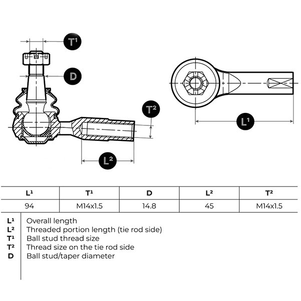 | القياسات: | الطول: 94 ملم الخيط: M14x1,5 الخيط الخارجي: M14x1,5 مفتاح الفك: 19 ملم ارتفاع مخروطي: 84 ملم |